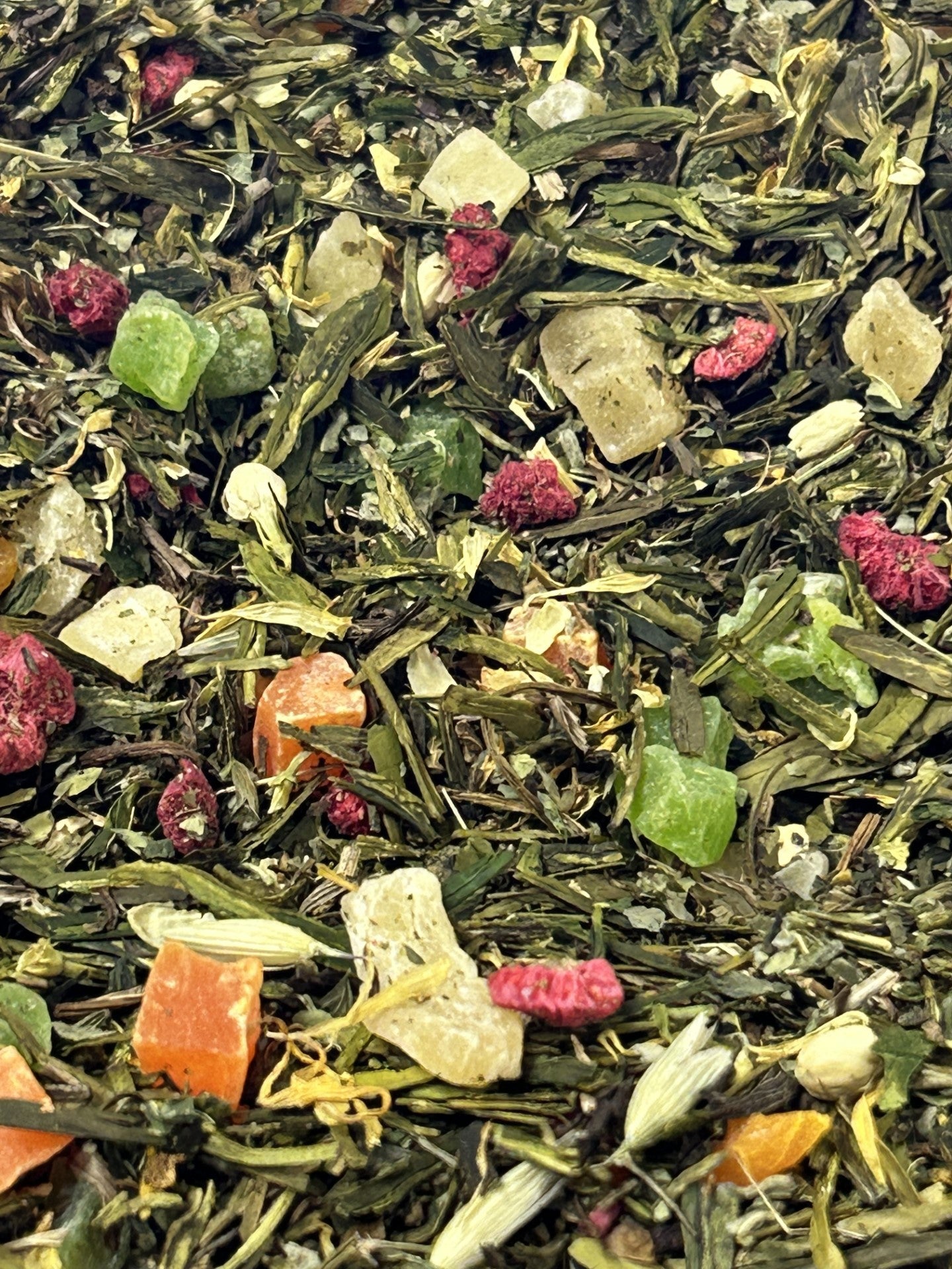 Imagine a verdant garden where luscious fruits ripen under the sun, and fragrant blossoms unfurl in a gentle breeze. This exquisite blend, "Tropical Dragonwell," begins with the delicate, fresh notes of premium Chinese green teas, providing a smooth and vibrant base.